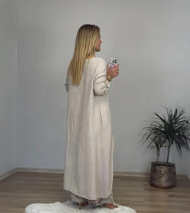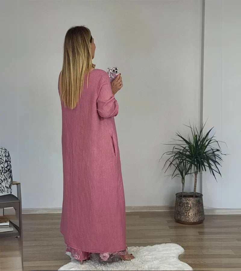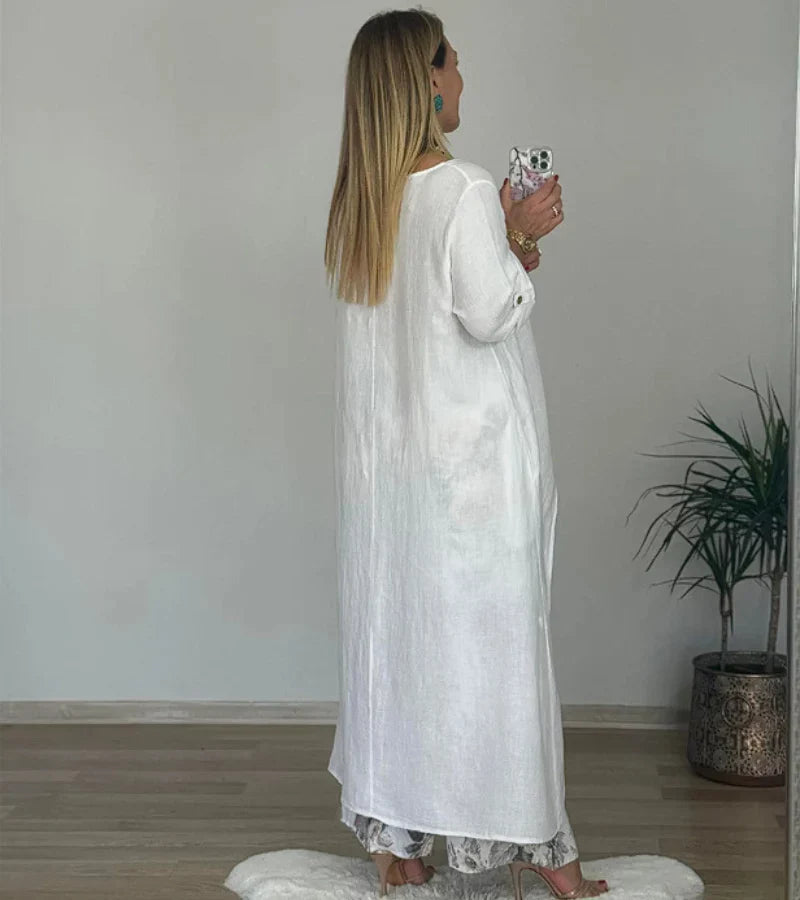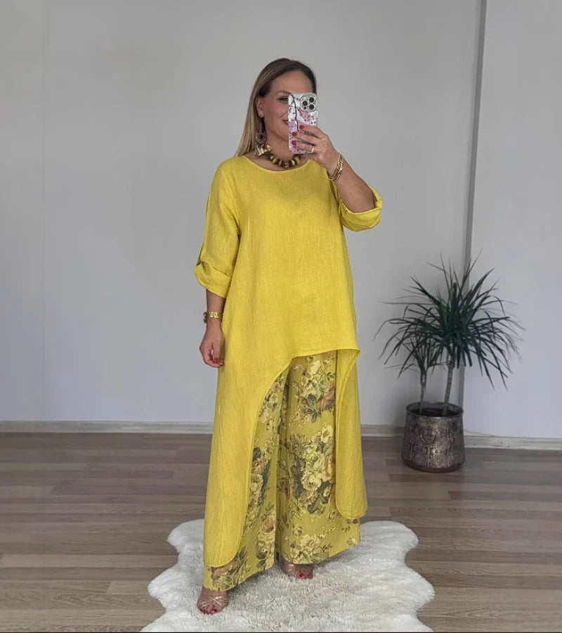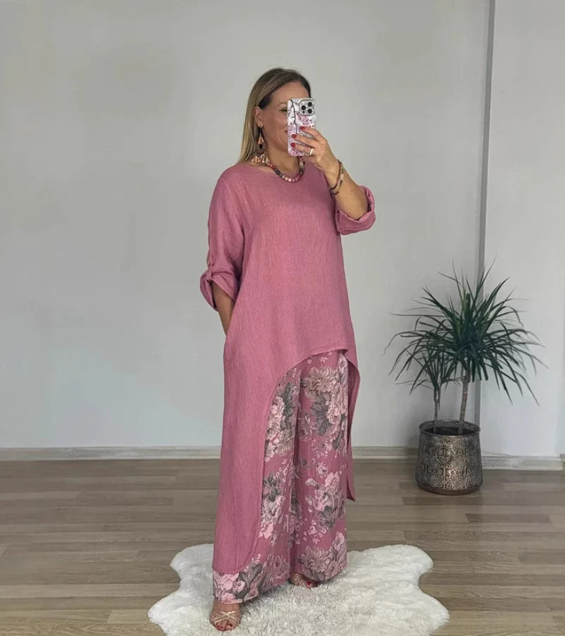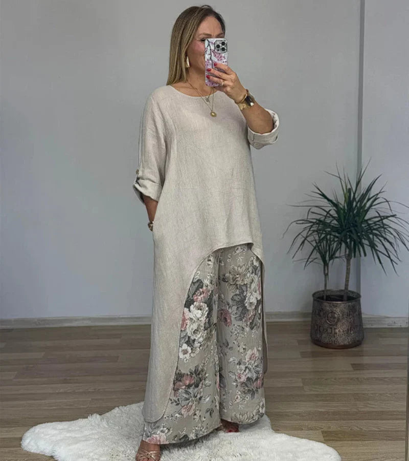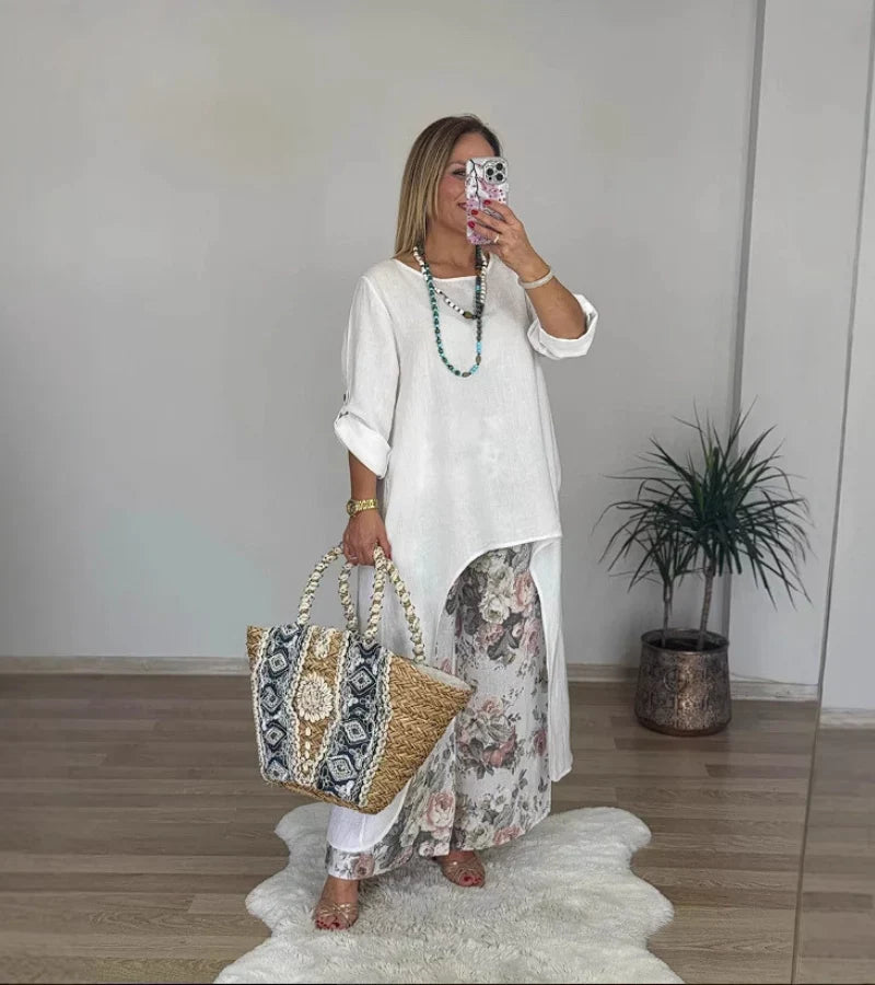 Il completo « IRINA » è un vero colpo di fulmine per chi ama gli outfit raffinati ma comodi. Con la sua tunica asimmetrica e i pantaloni ampi con stampa floreale, unisce naturalezza, leggerezza e uno stile senza tempo. Perfetto per ogni tipo di silhouette, dona una vestibilità armoniosa e una libertà di movimento impareggiabile.