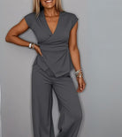 • Completo due pezzi: top incrociato + pantalone a gamba larga