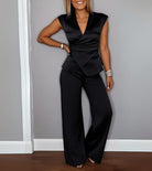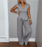 Scopri il nostro iconico completo due pezzi, pensato per valorizzare ogni silhouette. Il top incrociato effetto portafoglio sottolinea il punto vita, mentre il pantalone ampio slancia la figura con eleganza. Ideale per la donna moderna che desidera un look sofisticato ma comodo, perfetto per il lavoro, il tempo libero o le serate speciali.
